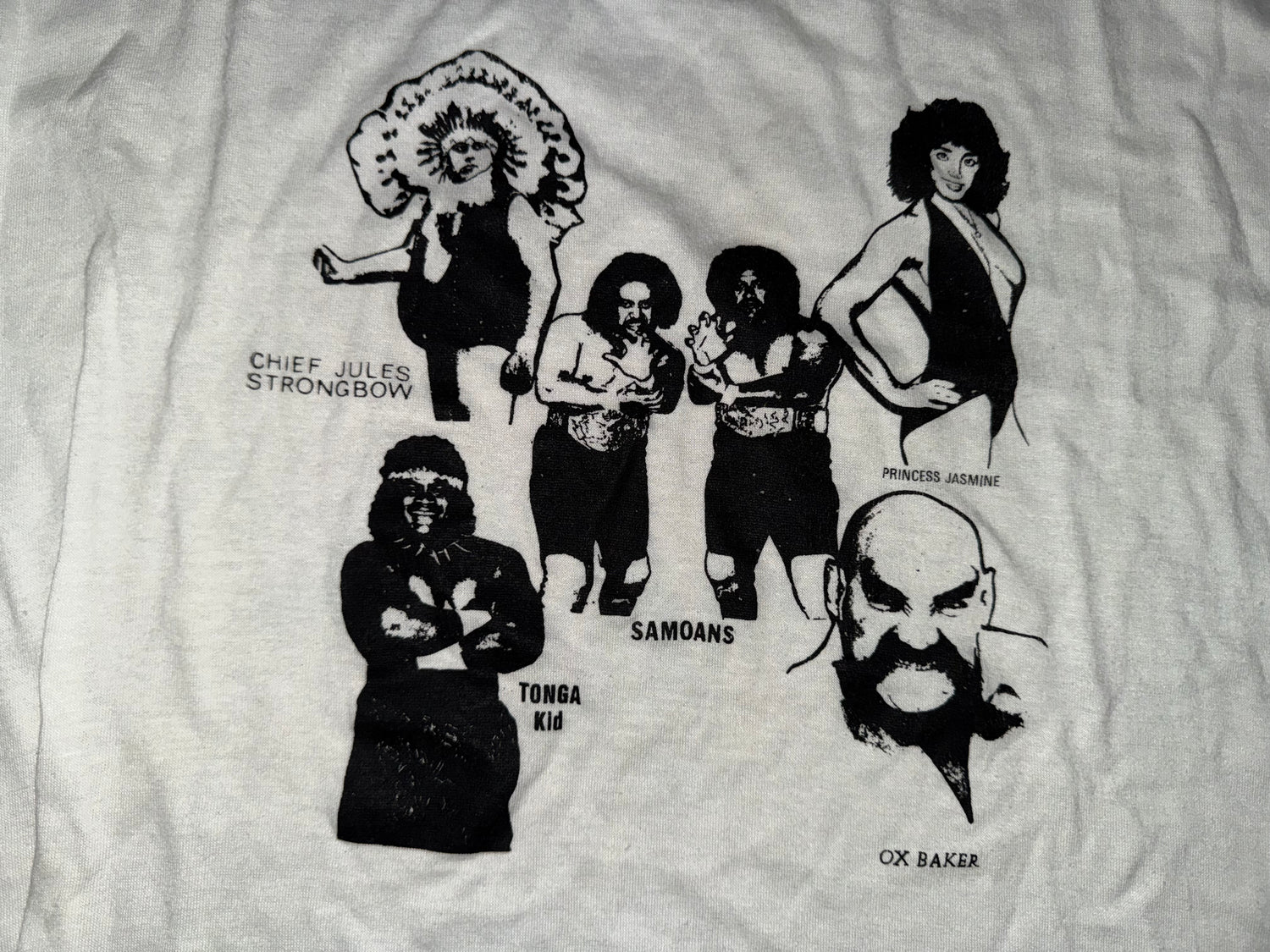 Mid 80s ICW (I think?) shirt featuring Tonga Kid, the Samoans, Ox baker, Jules strongbow and Princess Jasmine